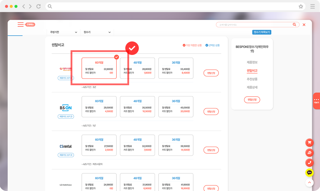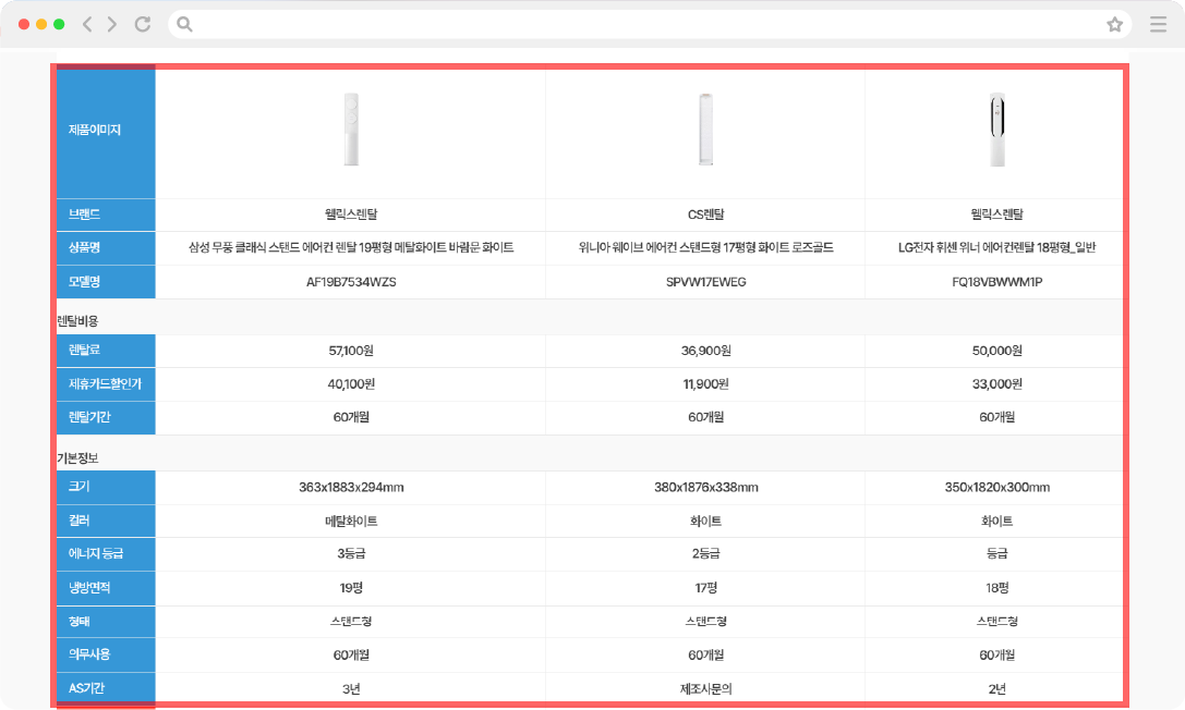 스펙부터 렌탈료 등 섬세하게 비교가 가능합니다.